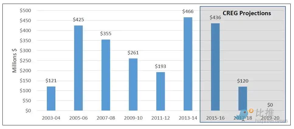 财政的断崖式缺口: 根据《Wyoming Public Media》援引的 CREG 官方数据,该州煤炭资源税从 2011 年的 2.9 亿美元一路跌至 2022 年的 1.7 亿美元,2025年该州煤炭产量预计将跌至历史第二低点,仅为2008年峰值的一半。而曾经作为学校基建重要来源的“煤矿租赁奖金(Bonuses)”甚至已经直接归零。