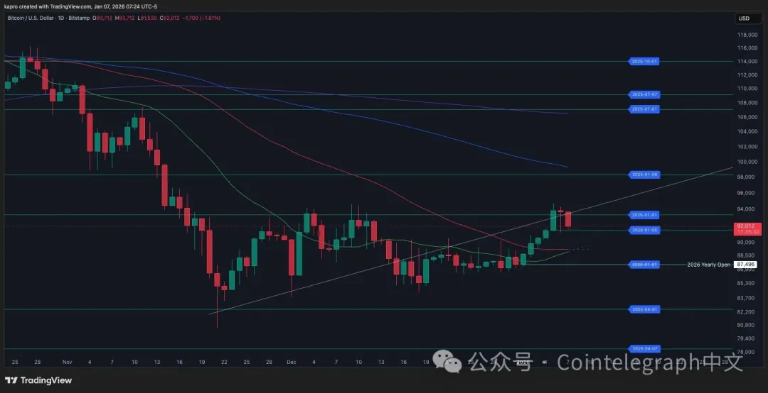 "FireCharts显示比特币订单簿中正在上演一场实时拉锯战,"他表示。"多头试图捍卫2026-01-05时间景观水平的支撑,但巨鲸似乎在寻求接近年度开盘价的支撑测试,然后再等D图表上形成金叉以触发下一轮上涨。"