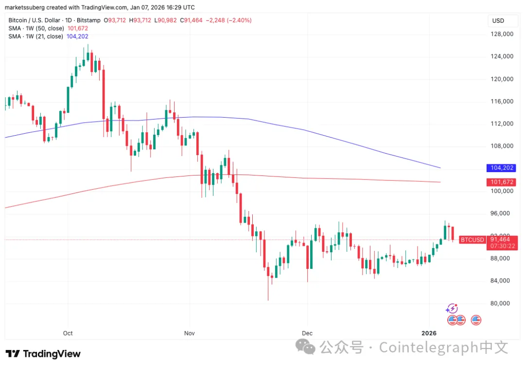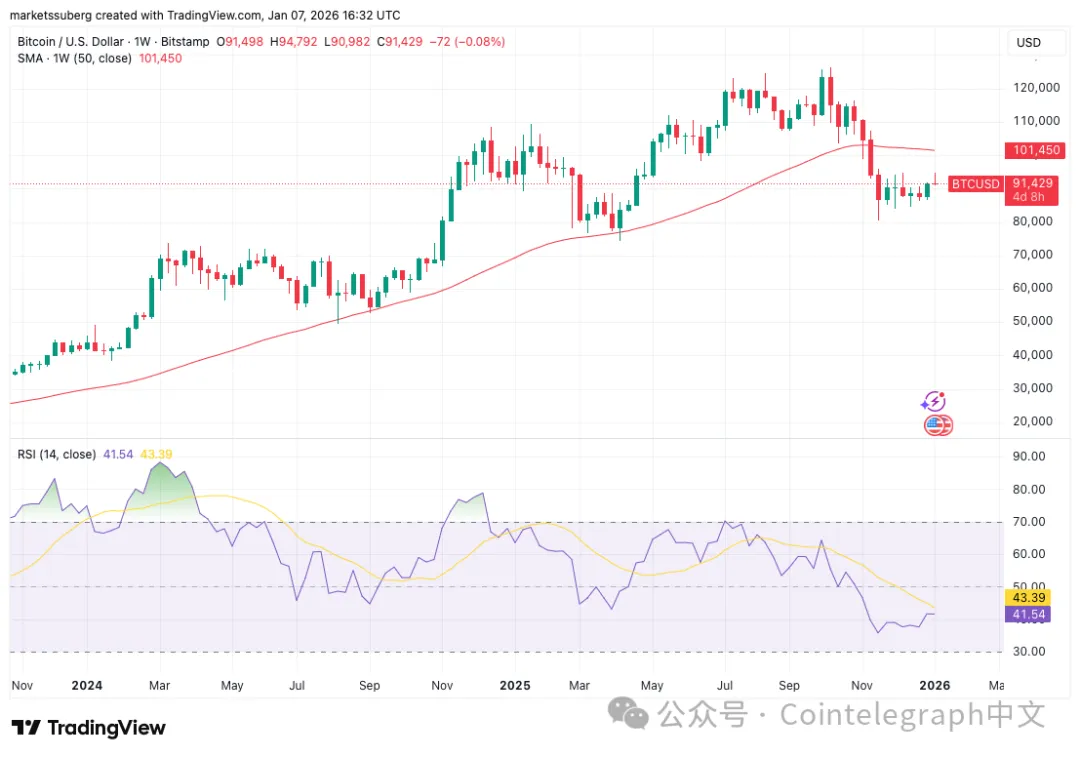 要实现真正的市场转向,需要周相对强弱指数(RSI)值超过41/100,同时周线收盘价需突破位于10.15万美元的50周简单移动平均线(SMA)上方。