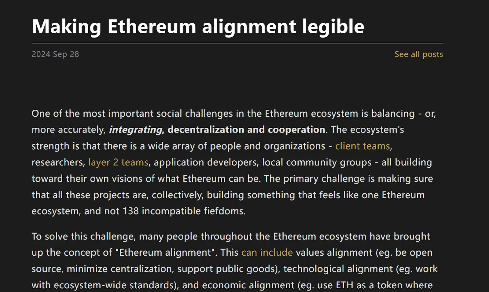 事实上,这种担忧并非空穴来风。早在 2024 年 9 月,Vitalik Buterin 就在《Making Ethereum alignment legible》中直言指出这一风险: