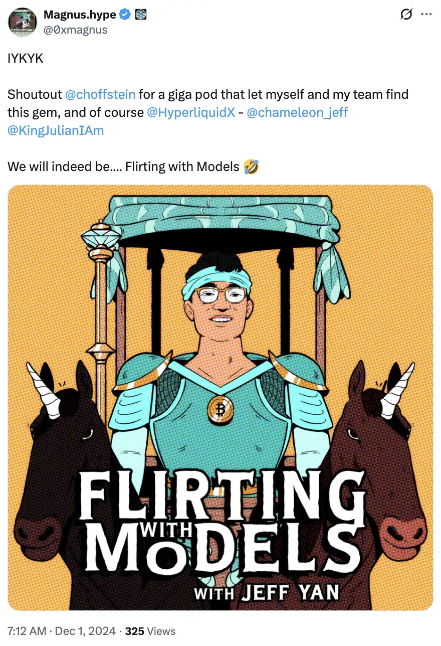 Kinetiq:是的,那个播客叫《Flirting with Models》,Jeff 是嘉宾,这让我们发现了 Hyperliquid。那是一期非常有见地的播客,清楚地展示了 Jeff 极高的智力水平。关于 Hyperliquid 的话题主要出现在播客的后半部分。最吸引人的地方在于,这个永续合约 DEX 是构建在自己的链上的。过去几年我们在深度使用和理解这些协议方面有丰富的经验,Hyperliquid 构建在自有链上这一点引起了我们极大的兴趣,剩下的就是我们见证到的历史了。