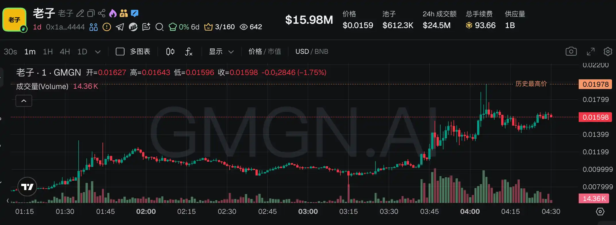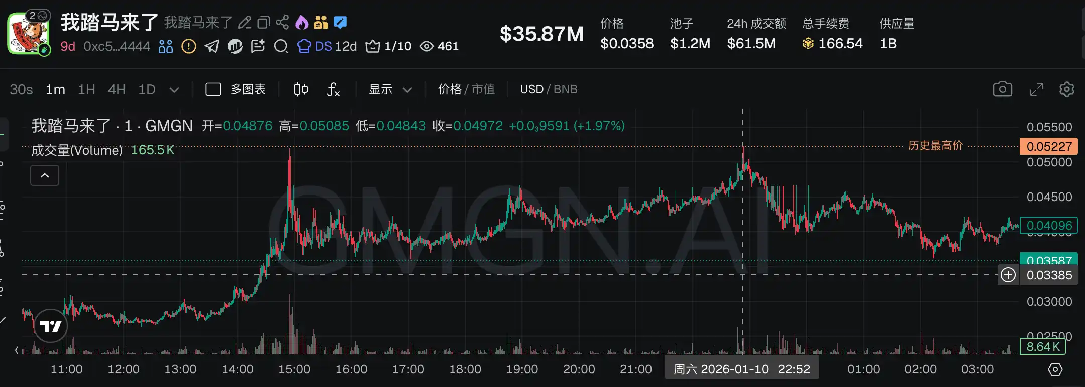 此前该 Meme 币一度冲高至 5200 万美元左右,现已回落至 3600 万美元左右。后续能否再次 ATH,仍然寄希望于能否实现币安合约、现货等里程碑式成就。
