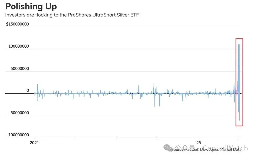 根据Wavers的风控监测,就在崩盘前夜的1月6日,竟有创纪录的 1.11亿美元 资金涌入反向做空白银ETF ($ZSL),试图在81美元的“天价”通过做空来博取回调。