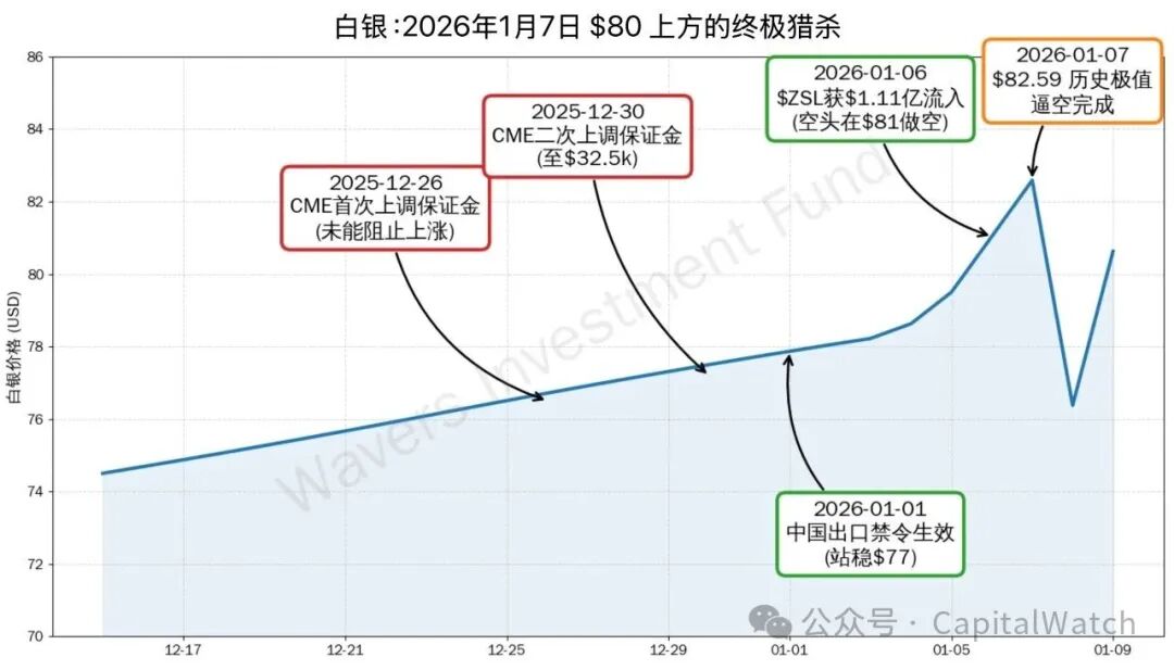 1月6日($81.04):CME(芝加哥商品交易所)连续两次上调保证金试图冷却市场,但这反而迫使资金不足的空头平仓。当晚,1.11亿美元空头资金进场,试图赌顶。