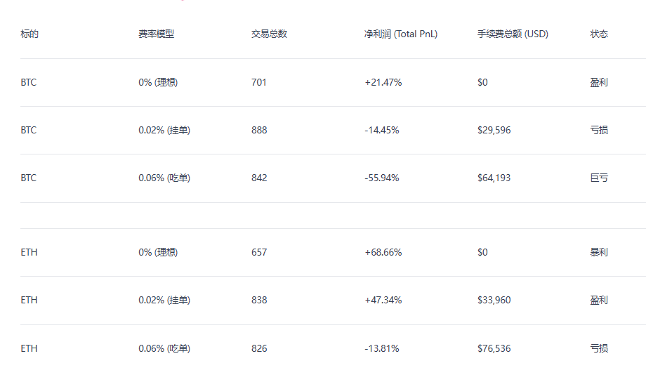 ETH 的波动率红利:ETH 展现了更强的爆发力。在理想状态下(0% 费率),其 68.66% 的收益率远超 BTC。这种高波动特性使得 ETH 在 0.02% 的 Maker 费率下依然能保持 47.34% 的可观收益。