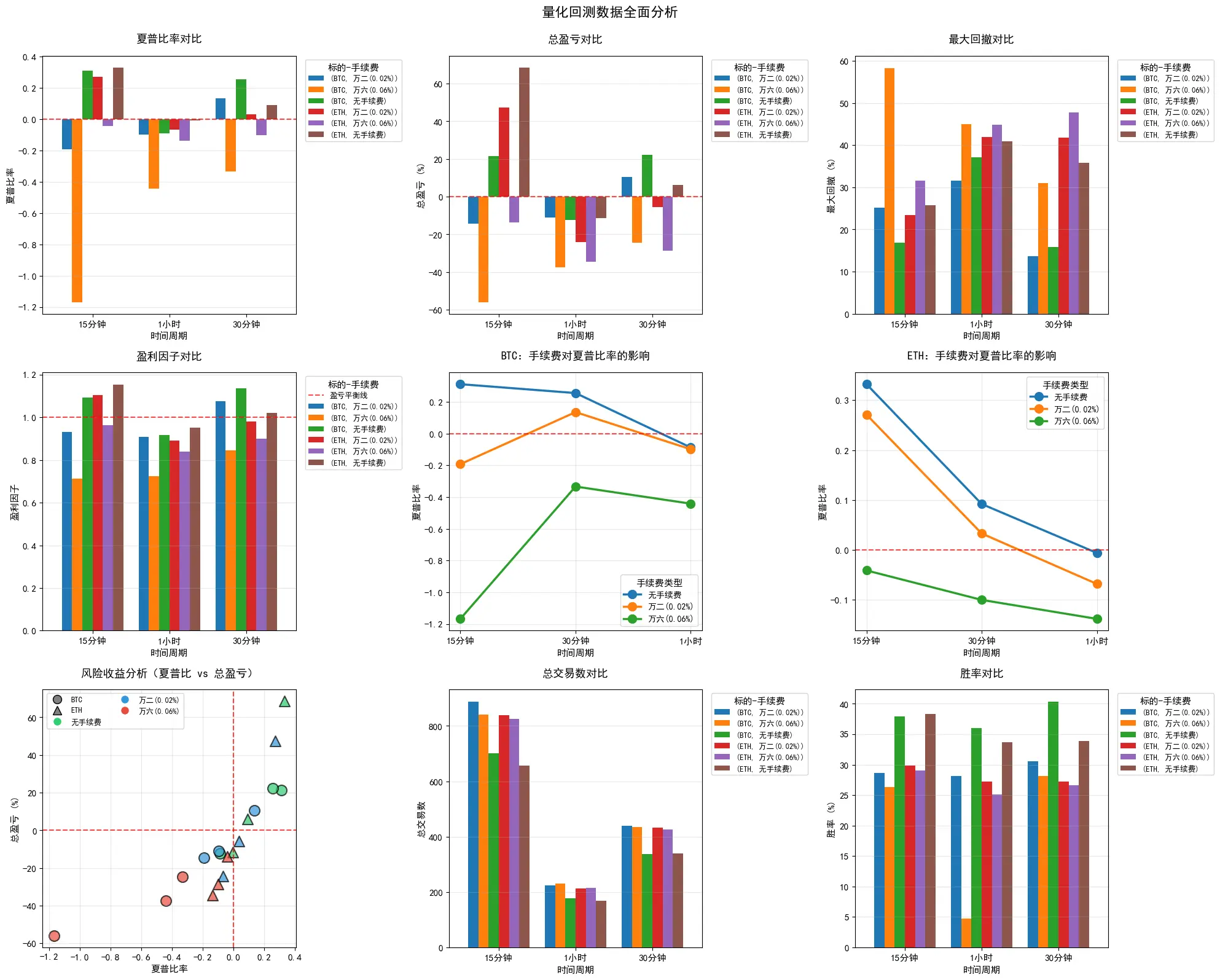 该回测采用 100% 仓位模式。在高费率下,连续的磨损下会加速本金缩水。BTC 15m (0.06%) 的最大回撤达到了惊人的 58.32%,这在实盘中往往意味着爆仓或心态崩溃。