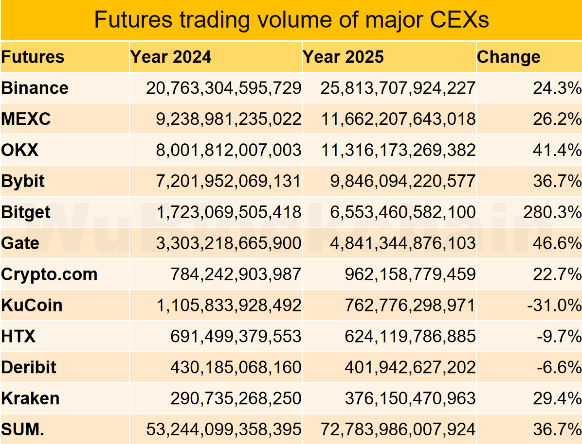 2025 年主要交易所的衍生品交易量相较 2024 年增加 36.7%。变化率排名前三名为 Bitget 280.3%、Gate 46.6% 与 OKX 41.4%。排名后三名为 KuCoin -31.0%、HTX -9.7% 与 Deribit -6.6%。