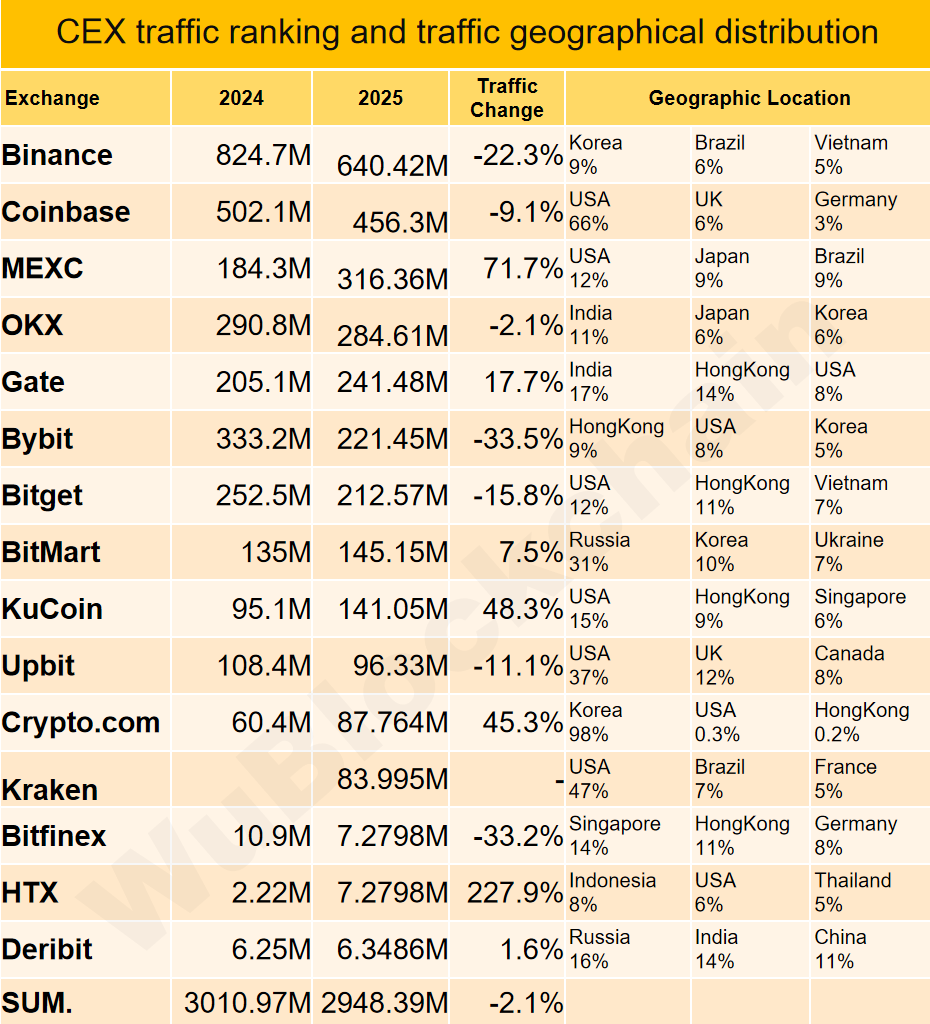 2025 年主要交易所的网站流量相较 2024 年下降 2.1%。变化率排名前三名为 HTX 227.9%、MEXC 71.7% 与 KuCoin 48.3%。排名后三名为 Bybit -33.5%、Bitfinex -33.2% 与 Binance -22.3%。