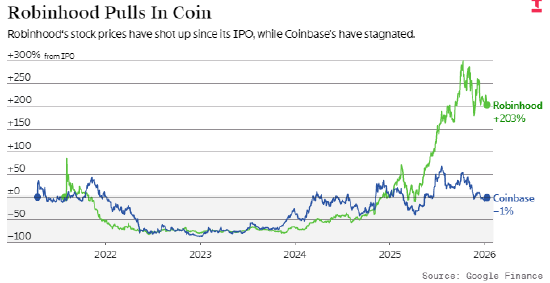 Robinhood股价去年大涨 186%,远超币安 12% 的跌幅。