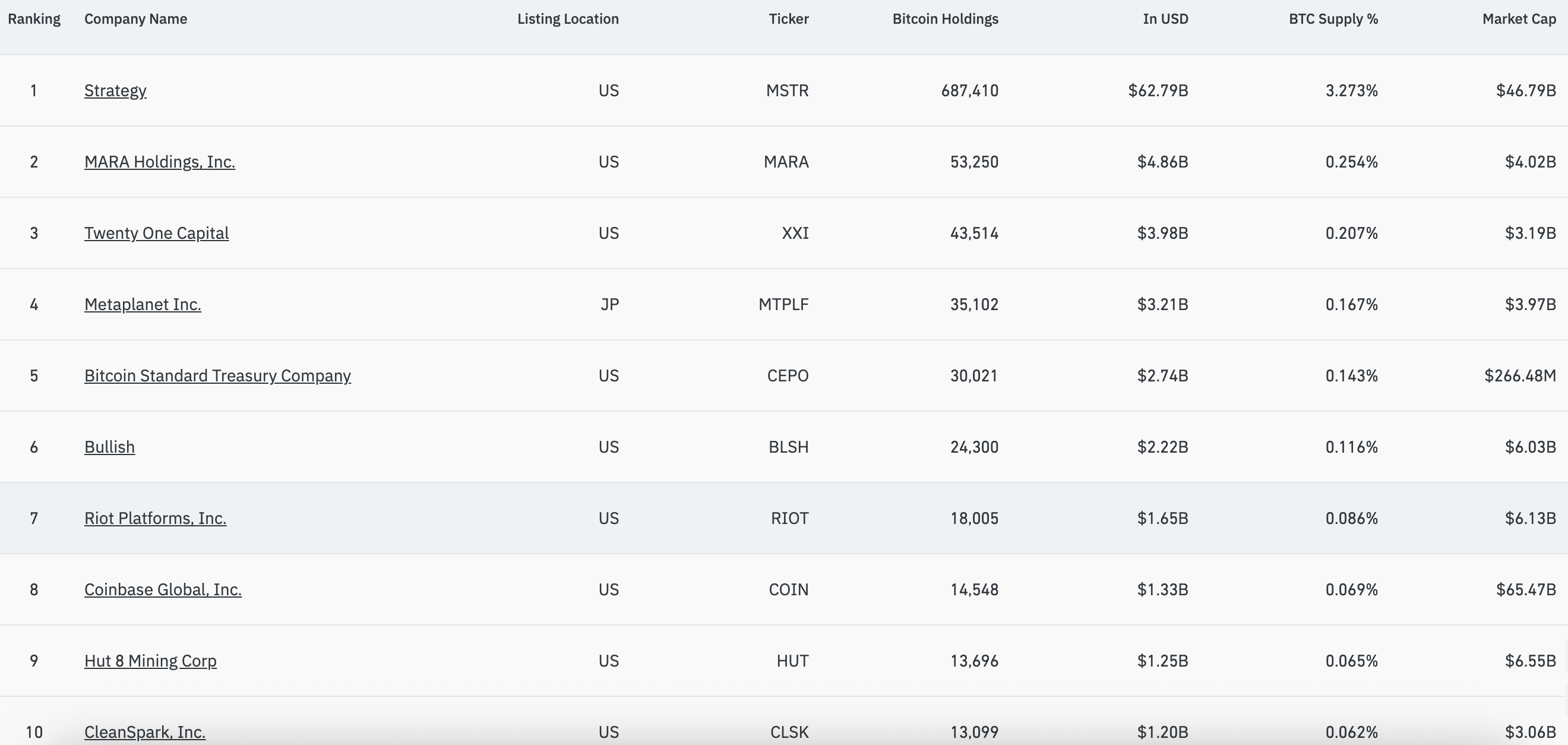 Top10上市公司持仓量,数据来源:Coinglass