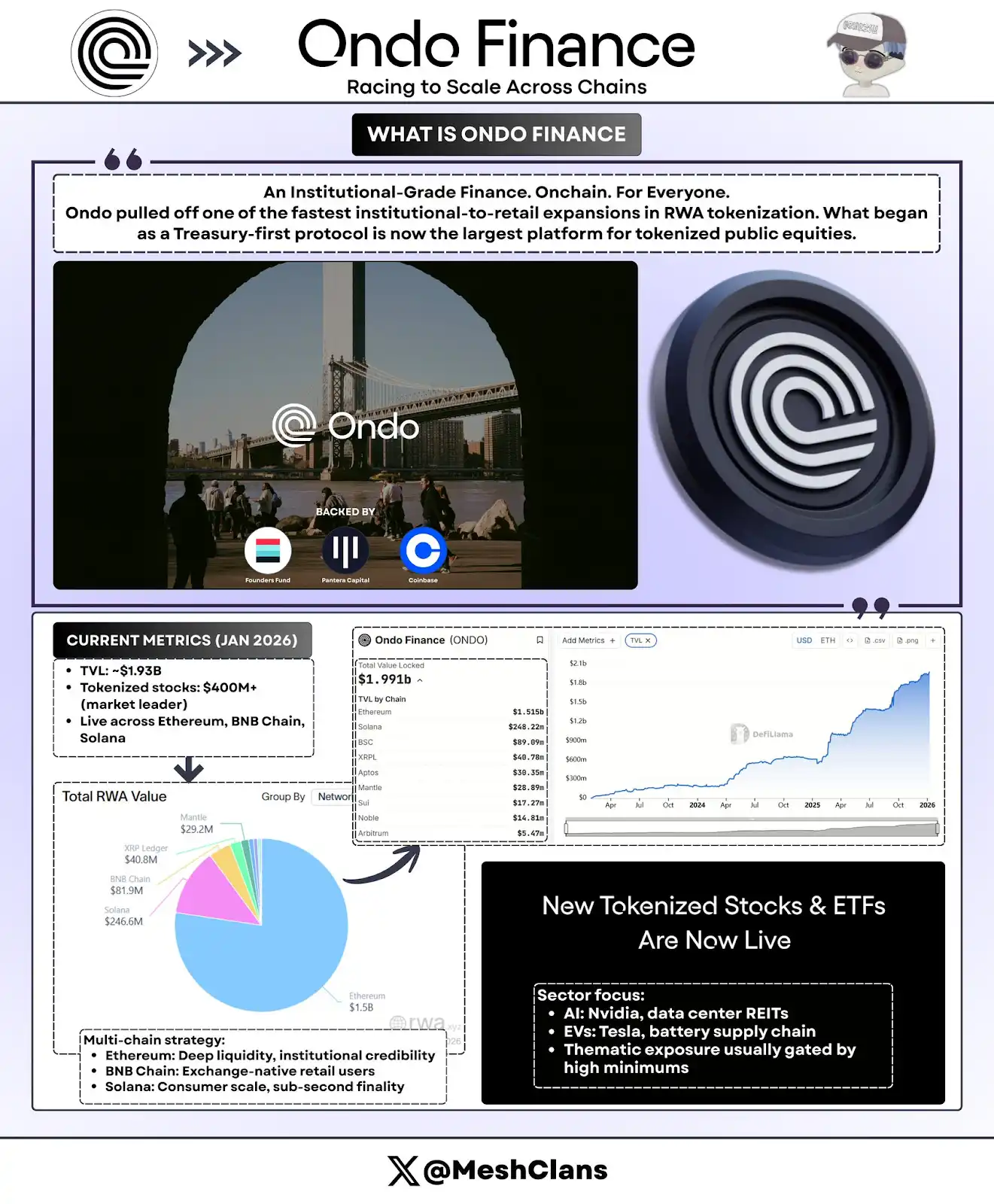 2026年1月8日,Ondo一次性推出了98种新代币化资产,涵盖人工智能(AI)、电动车(EV)和主题投资等领域的股票和ETF。这不是小规模试水,而是快速推进。