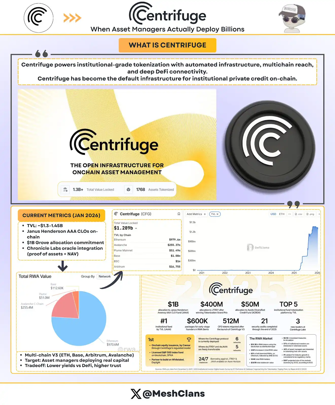 Centrifuge已成为机构级私募信贷代币化的基础设施标准。截至2025年12月,协议的TVL已飙升至13亿至14.5亿美元,这一增长由实际部署的机构资本推动。