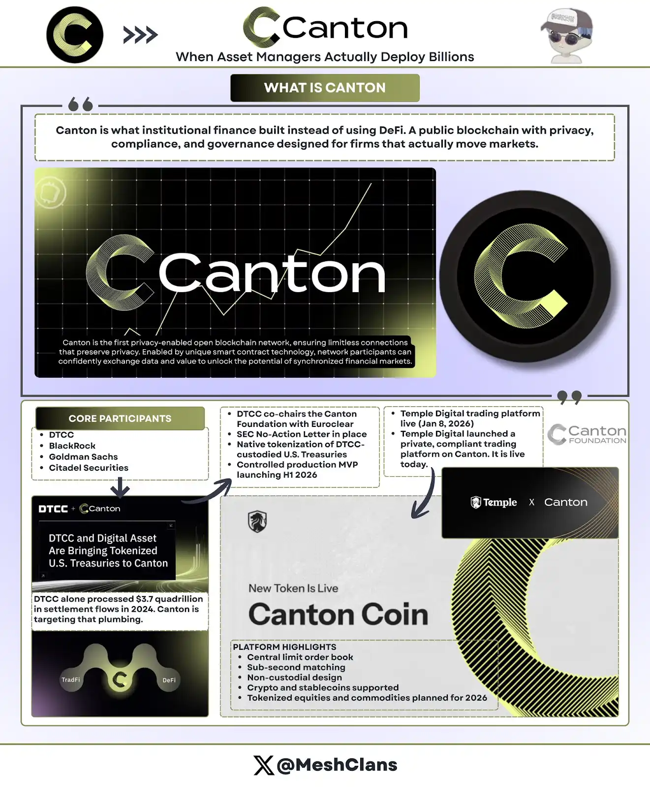 Temple Digital平台上线(2026年1月8日):Canton的机构价值主张在Temple Digital Group于2026年1月8日推出的私人交易平台中得到了进一步明确。