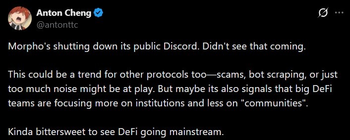 Nifty Gateway联合创始人Duncan Cock Foster分享称,管理Discord是他前公司运营中最棘手的部分,对其心理健康也是巨大消耗。他认为Morpho的举动“明智”。
