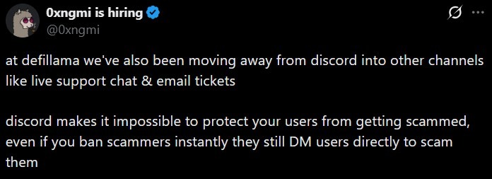 0xngmi也表达了类似担忧。在帖子中,这位DefiLlama创始人表示,他们的平台已转向实时客服聊天及邮件工单,并认为Discord根本无法保障用户安全。