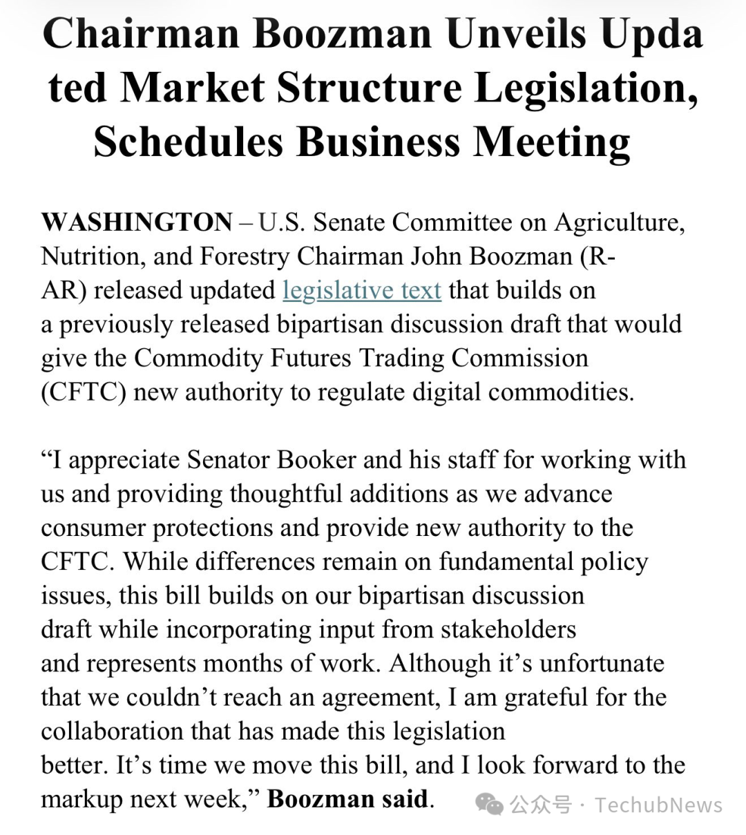 值得一提的是,美国参议院农业委员会主席 John Boozman 今日透露,这份最新法案文本是在此前美两党讨论的草案基础上制定的,虽未能与民主党人达成协议,但他仍期待下周的审议。此言一出,不禁让这份法案蒙上了一层不确定性的阴影,文本内容可能因此会发生改变。