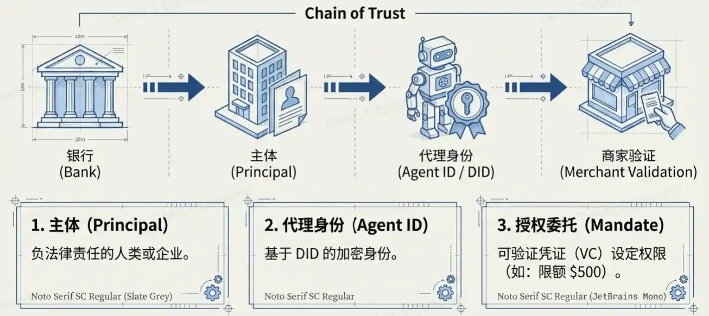 当 Agent 发起交易时,它会出示一个 VC。验证方不需要信任 Agent 本身,只需要验证 VC 上的数字签名是否来自可信的发行方。这种机制创造了一个“信任链”:银行信任企业 -> 企业签发 VC 给 Agent -> 商家验证 VC -> 交易通过。