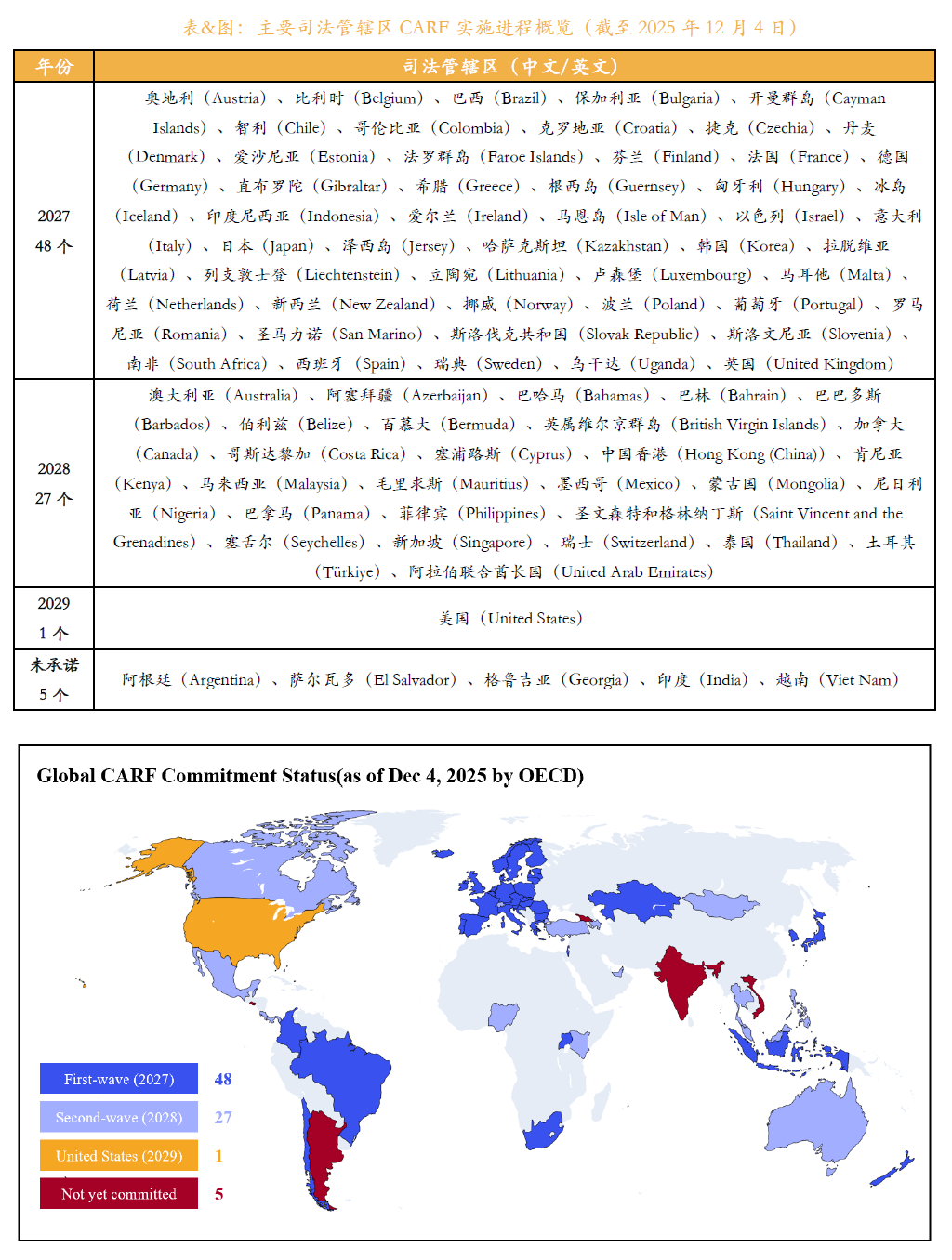 根据OECD全球论坛发布的信息,截至2025年底,已有76个国家和地区承诺实施CARF,并将分批推进制度落地。