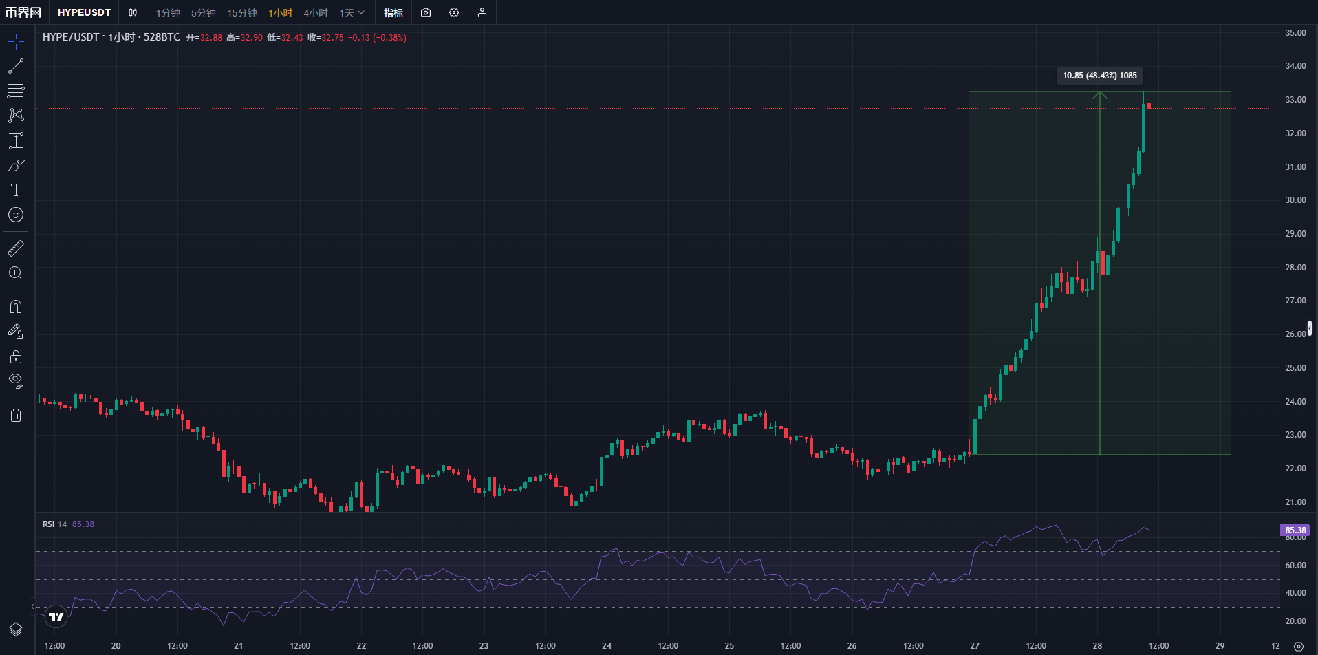 在撰写本文时,HYPE的价格仍在持续上涨!其代币价格自昨日凌晨的22.35美元起就一路疯涨,目前最高价格已触及33.26美元。而且,当前该代币的强劲上涨势头貌似还在继续,因此,该代币接下来的价格走势值得持续关注。