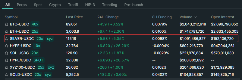 而在今天1月28日,这一趋势仍在延续。目前,Hyperliquid去中心化交易所的白银(SILVER)永续合约的交易量已达10.91亿美元,继续保持仅次于比特币和以太坊的永续合约交易量。