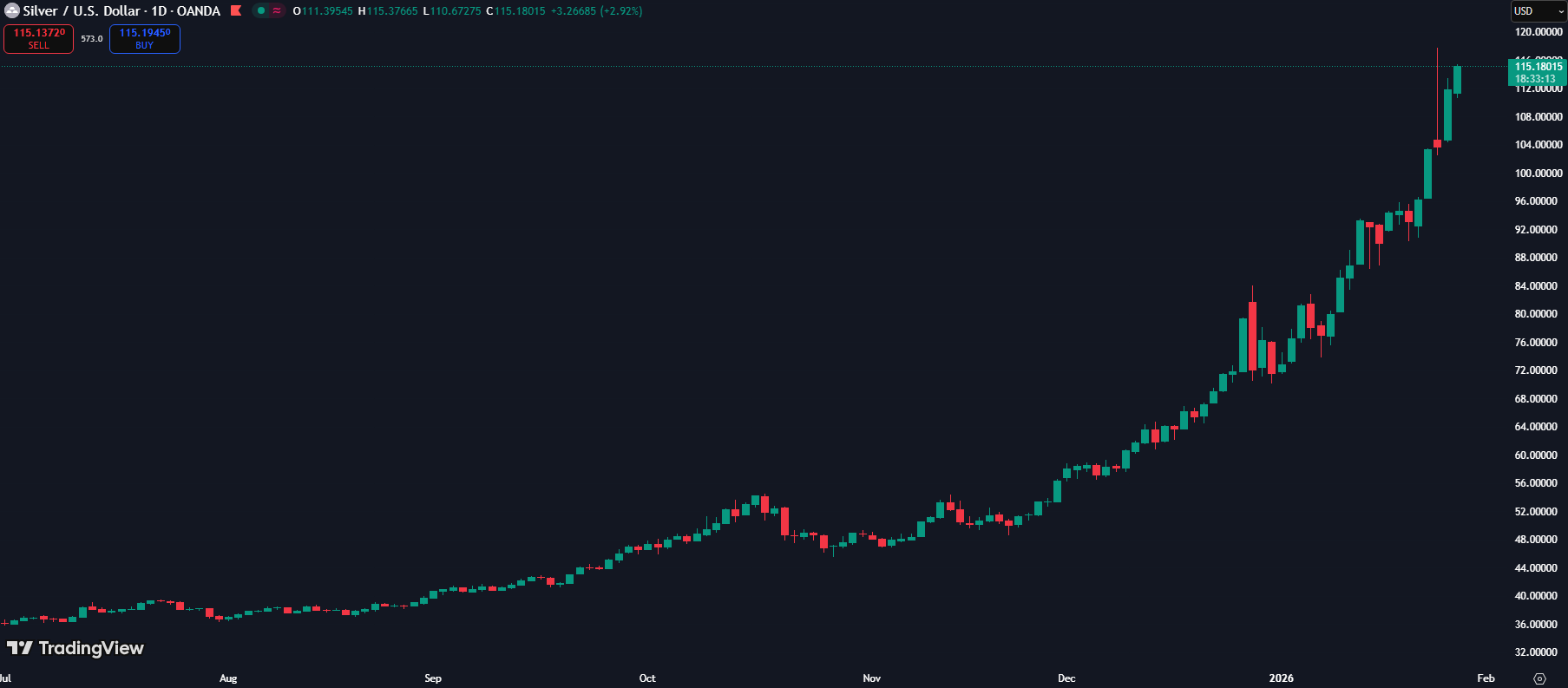 而在当前的全球白银现货市场,白银价格仍在持续上涨,可能将继续创下一个又一个的历史高点。目前,白银的最高价格已触及117.75美元,这也证明了全球投资者对贵金属避险需求的情绪仍在升温,全球市场对白银作为避险资产的关注度持续攀升。