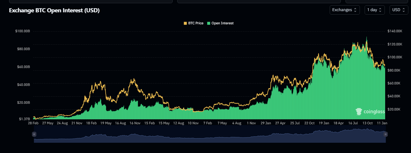 然而,市场的另一端却暗流涌动。据 Coinglass 的数据显示,全网交易所的合约持仓量维持在历史高位。QCP Capital 的交易员在近期的播客中警告,这意味着大量的高杠杆博弈者正在场内潜伏。