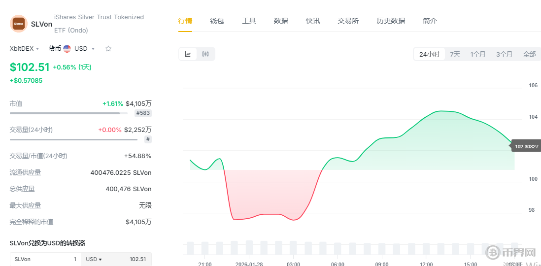 Ondo Finance推出的SLVON是iShares Silver Trust的代币化版本,也是目前增长最快的代币化白银ETF之一。