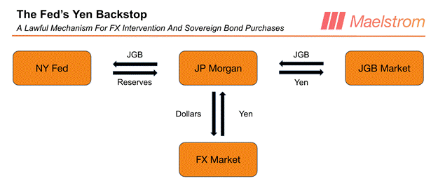在我提供将触发按下「印钞」按钮的背景信息之前,让我先用这张图表来描述美联储将如何通过印钞来扩大其资产负债表,并干预美元兑日元汇率及日本国债市场。