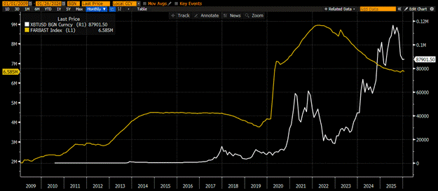 随着日元兑美元走强,比特币下跌。在确认美联储正在印钞干预日元和日本国债市场之前,我不会增加风险敞口。如果美联储资产负债表上的「外币计价资产」项目周环比上升,那就是我增加比特币持仓的时候了。谢天谢地,在日元波动之前,我已经止损离场了我的做多 Strategy (MSTR US) 和 Metaplanet (3350 JP) 的交易。如果我的假设正确,我将重新进入这些加了杠杆的比特币代理资产。