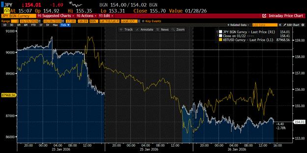 2026年1月23日星期五,日本央行维持利率不变,而在所有指标都显示他们本应加息以捍卫货币和债券市场的时候。我假设植田大人给太平洋对岸的「外国爸爸」打了个电话求助,这开启了美联储与财政部联手干预的讨论。