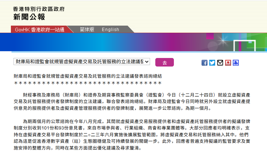 2025年12月24日,香港财经事务及库务局(财库局)与证券及期货事务监察委员会(证监会)就规管虚拟资产交易及托管服务的立法建议联合发表咨询总结,并同时就另外设立就虚拟资产提供意见的服务提供者、虚拟资产管理服务提供者的发牌制度,进一步开展为期1个月的公众咨询。