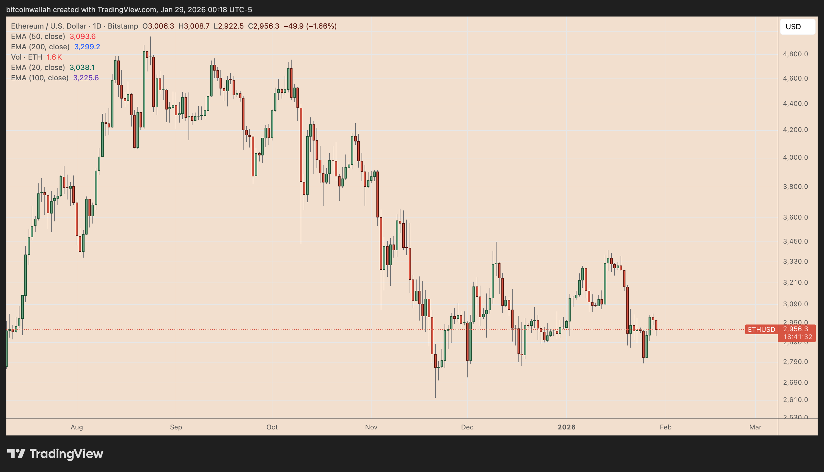 ETH目前较其本地高点3400美元下跌超过14%,凸显了在3000美元以上卖方的顽强。看跌技术形态显示,这种压力或将延续至2月。