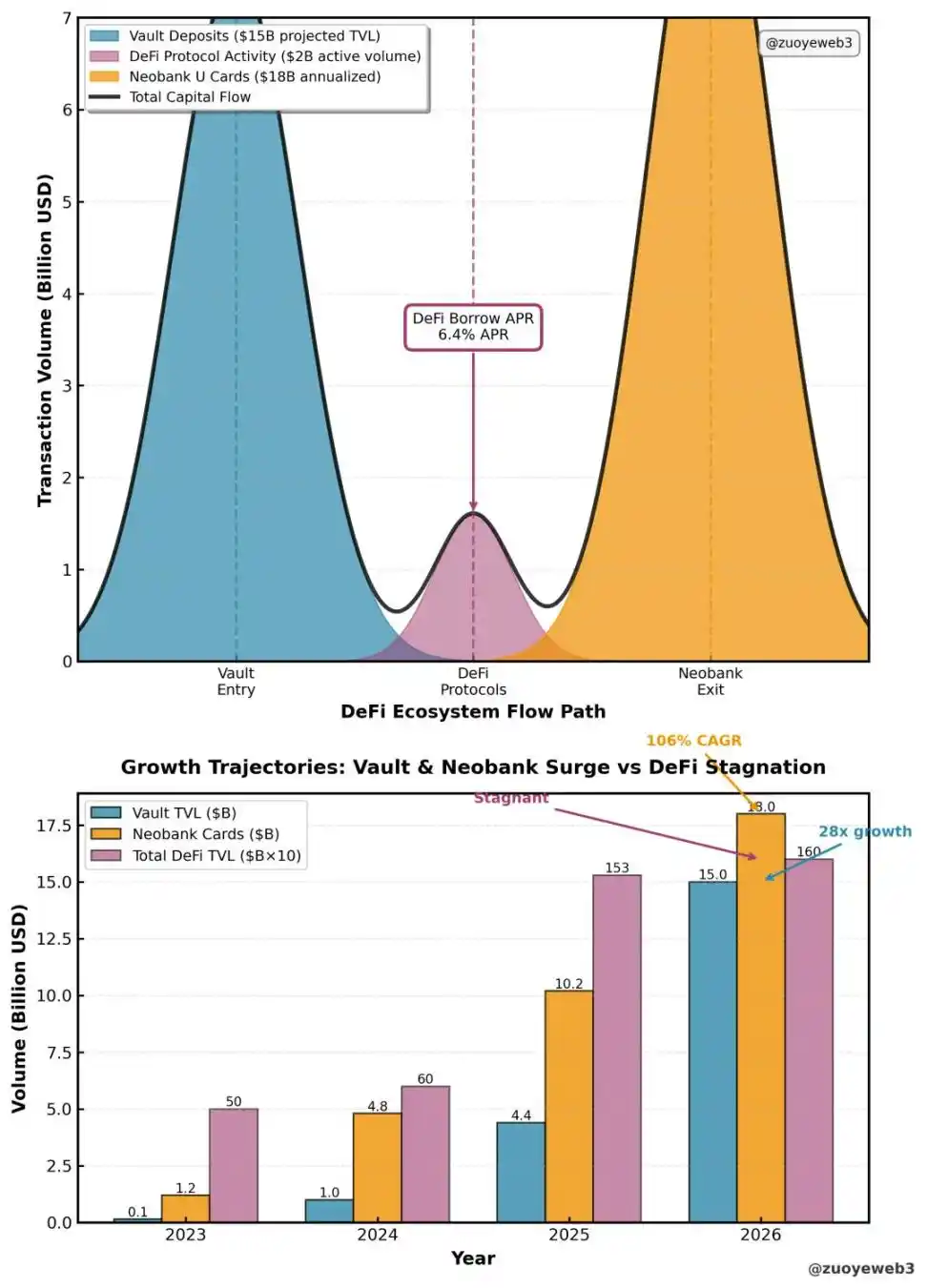 基于 2026 年的现状,实际的用户使用流程:通过 CEX 或者银行卡换取 USDC –> 找到 APY 更高的 Vault –> 使用 Neobank 的 U 卡消费