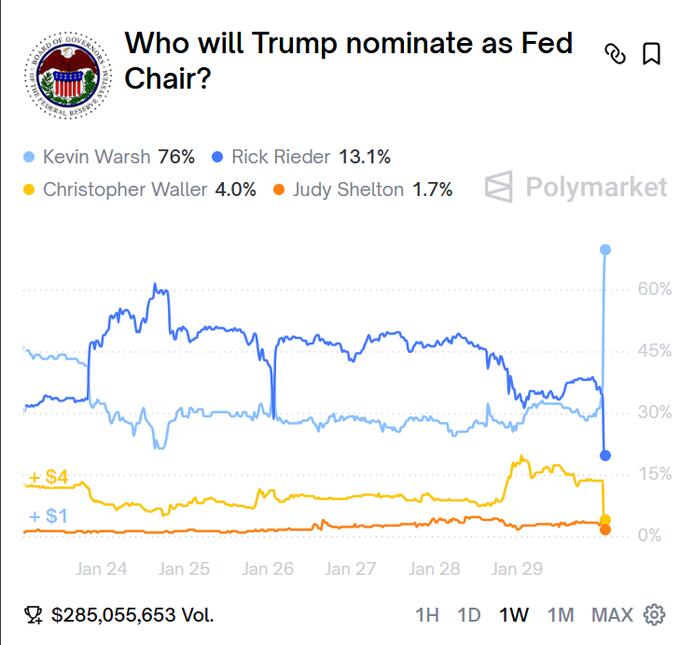 预测市场Polymarket最新显示,美联储前理事Kevin Warsh被特朗普提名为美联储新主席的概率飙升至79%。