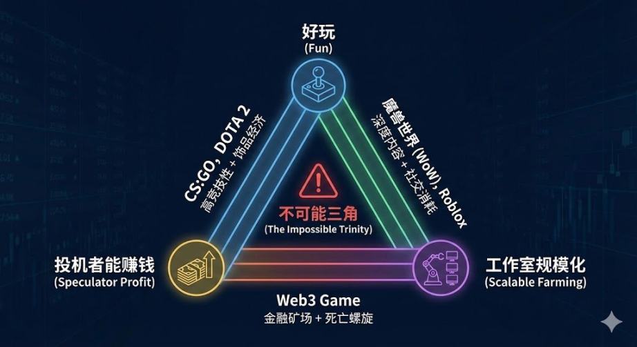 这有点像是一个游戏的不可能三角,在好玩,投机者能赚钱,工作室能规模化之间,你最多只能实现两角。