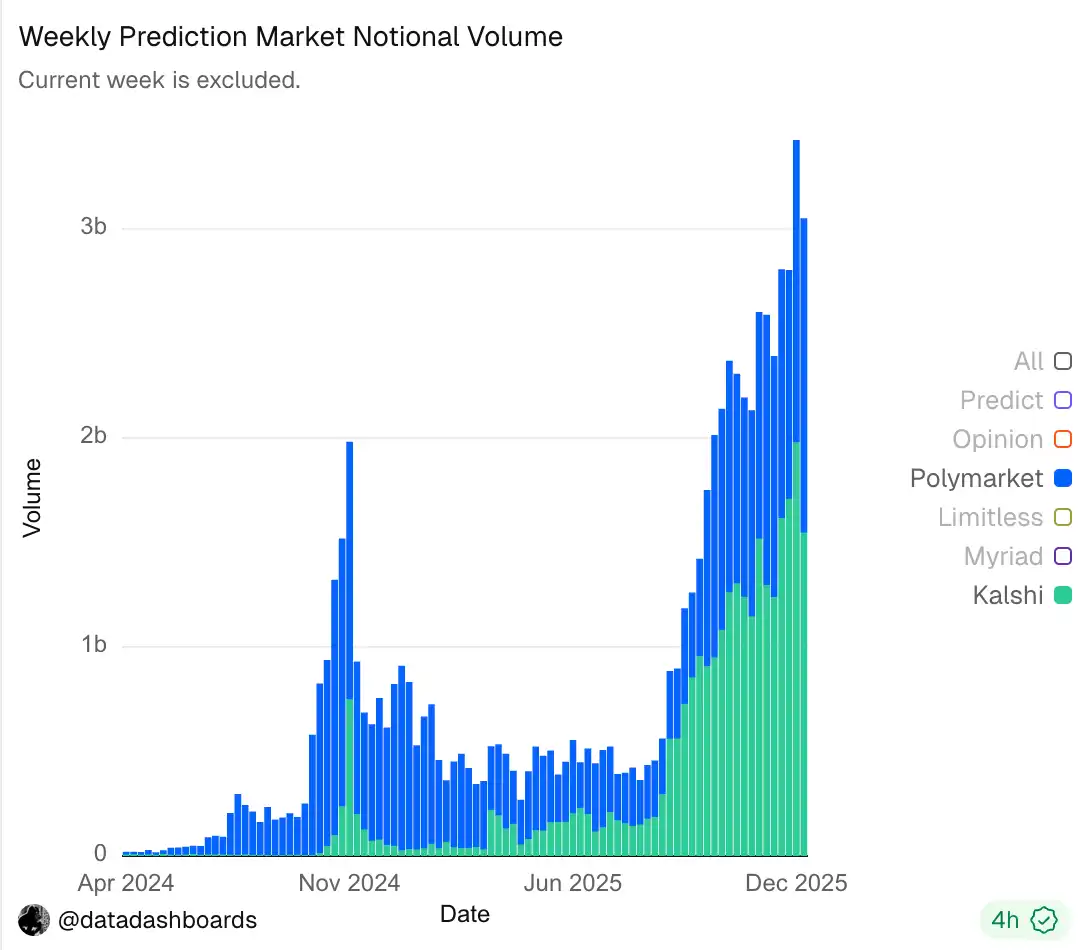 2025 年,预测市场完成了从加密边缘产品向主流金融应用雏形的关键跃迁,整体交易规模与参与度显著抬升。当前主流预测市场的月度交易量已稳定超过 100 亿美元,年内累计交易量超过 400 亿美元。尽管其绝对体量仍明显小于股票、期货等成熟金融市场,但作为一个独立的新资产形态,预测市场展现出了极为突出的增长斜率,已进入明确的加速扩张阶段。