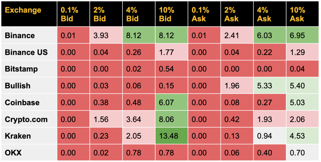 根据 Kaiko 的数据(图 1)订单簿深度显示,一些交易所的“比特币流动性在各个价位上几乎为零” — — 除了币安、Crypto.com 和 Kraken 等主要交易所外,其余交易所在 4% 价差范围内几乎没有买单。这种流动性稀薄意味着每次强制抛售对价格的冲击都更大。此外,跨平台风险管理与套利功能也遭遇障碍。