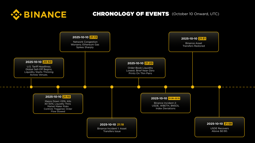 注:关于币安“10/11事件”之所以有时也被写成“10/10”,主要是因为不同人引用的时间口径不一样:不少数据/英文叙述按 UTC 或美东时间记述,而中文社区通常按 UTC+8(北京时间);当关键波动发生在 UTC 的深夜、换算到 UTC+8 就已跨到次日清晨,所以同一波行情会同时出现“10/10”和“10/11”的表述。