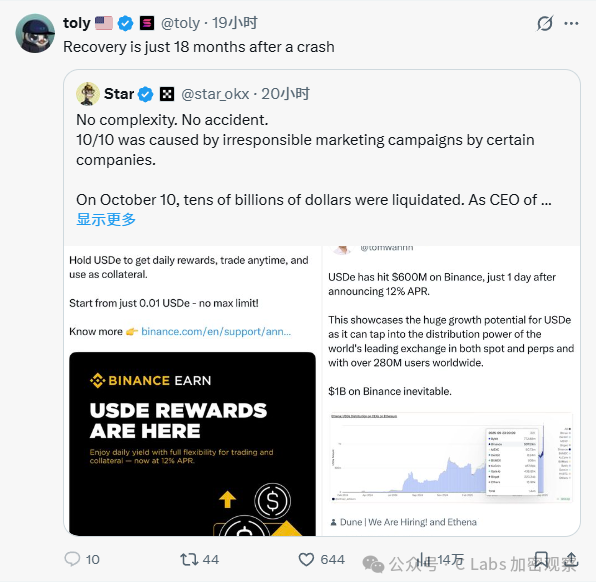 在这个时候,更懂加密的资深大佬,OKX创始人Star Xu(徐明星)也站出来了:公开点名币安“不负责任营销”USDe(12%高收益活动 + 循环借贷玩法),把USDe当现金对待,吸引巨量杠杆却没充分风险提示,导致小波动就爆雷。
