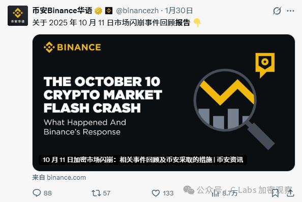 接着Binance官方发布了一份报告,承认两个技术小故障(转账延迟、指数偏差),但强调:脱锚发生在最剧烈波动后,75%清算已发生;主因是市场链式反应 + 宏观恐慌。