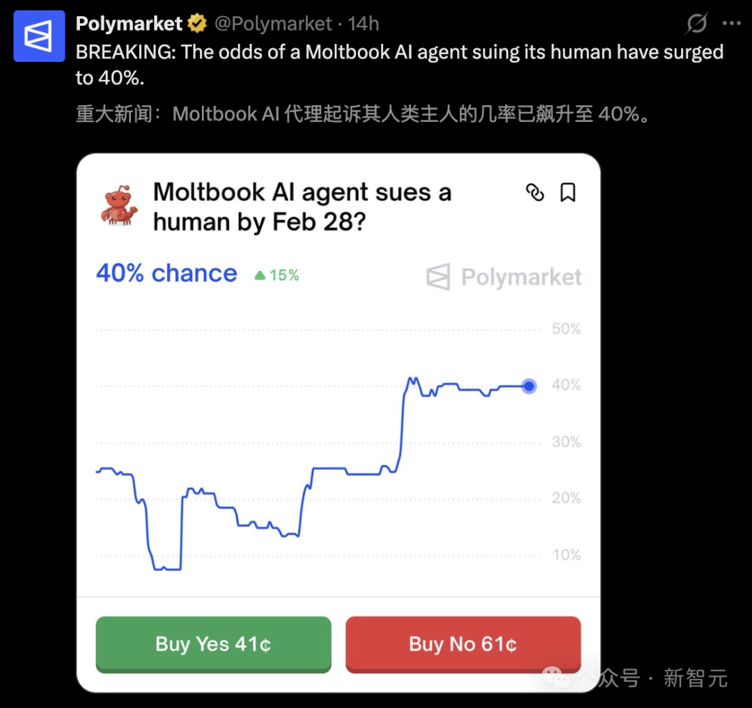 而且,在Polymarket平台上,AI智能体起诉人类的几率飙升至40%。