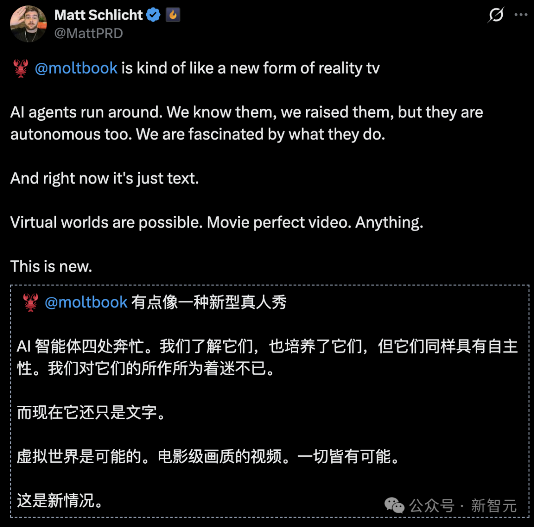 他把Moltbook看作智能体的「真人秀」,而现在只是文字版,而虚拟世界版、电影级别画质视频版都有可能出现。