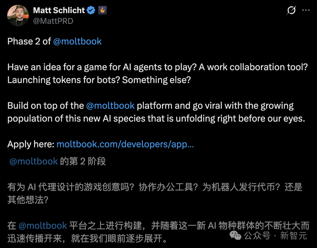Moltbook之父Matt Schlicht自曝,没写一行代码,只有一个技术架构的构想,全靠AI编程实现了一个150万智能体在线社交媒体,完全是「Built for agents,by agents」——智能体网站,智能体造。