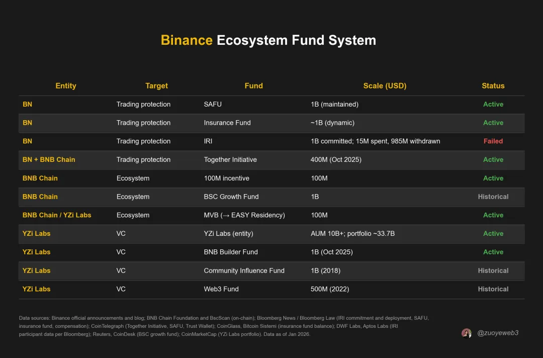 如果细数一下币安发起的各个计划,似乎特别偏好 10 亿这个数字,好比孙宇晨那永远领不到的 100 万奖励,除开 YZi Labs 主基金外,币安承诺的各类基金在 50 亿美元以上,但是真正落到实处的连 1 亿美元都没有。