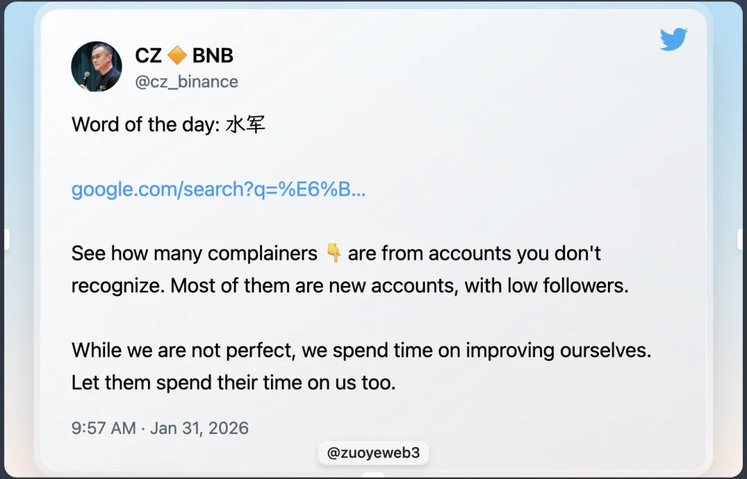 在币安和 CZ “闯美”失败后,你会惊奇的发现,CZ 开始用中文发推,并且要给英文 CT 科普“水军”的含义,好像 CZ 和华人用户的关系又近了一步。
