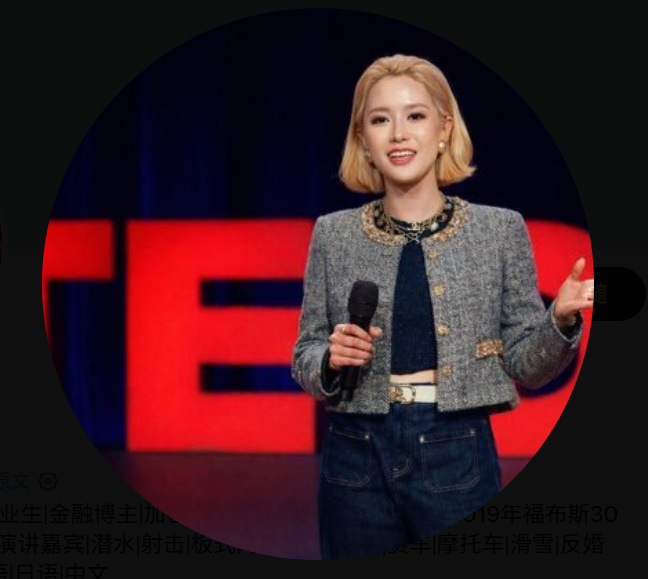 在自我介绍中,曾颖自称系早稻田大学金融系毕业生、加密货币元老,在微博有250万粉丝,还曾是2019年福布斯30岁以下精英之一,也是TEDx演讲嘉宾。此外,她还特别强调自己是“反婚姻倡导者”,擅长潜水、射击、板式网球、网球、划船、赛车、摩托车、滑雪,妥妥的新时代女性名媛范。