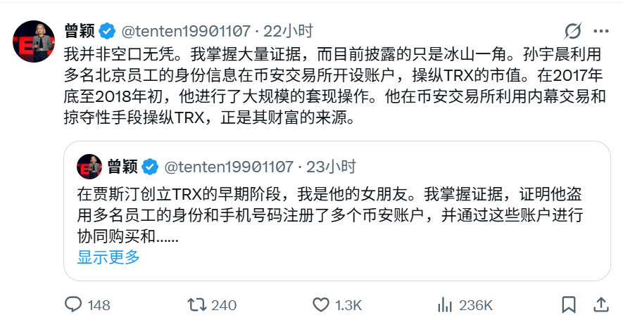 周日,一名用户名为“曾颖@tenten19901107”的X用户发帖称,她是孙宇晨早期创办TRX期间的女友。