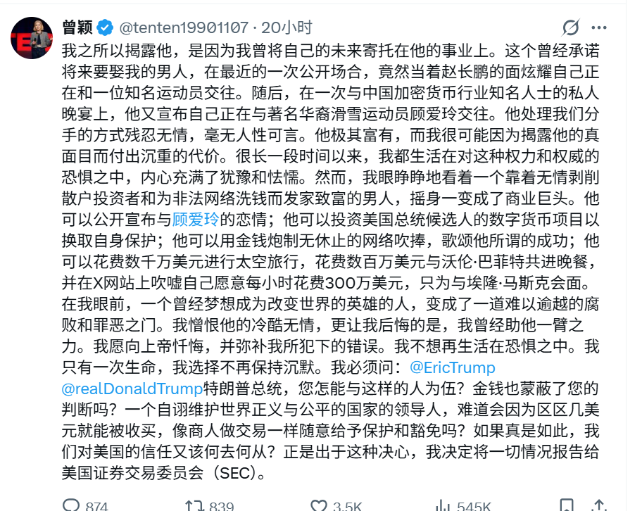 曾颖还@特朗普 并发起质问:“您怎能与这样的人为伍?金钱也蒙蔽了您的判断吗?”