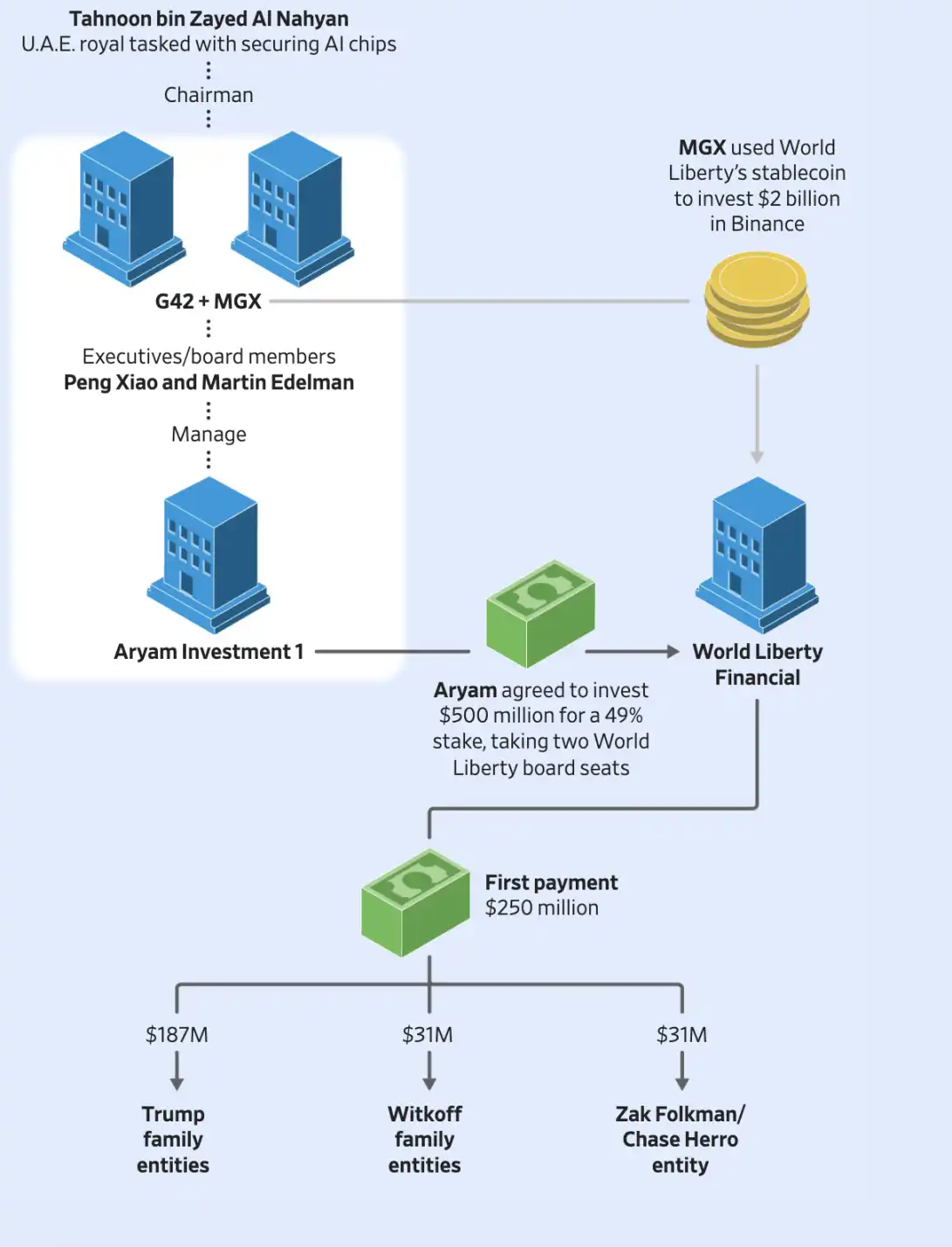 该协议使 Aryam 成为 World Liberty Financial 最大股东,也是该公司创始人之外唯一已知的外部投资者。文件显示,交易为 Aryam 在 World Liberty Financial 五人董事会中争取到两个席位,获任董事的两名 Aryam 高管同时在 Tahnoon 的 G42 担任高管;彼时董事会成员包括 Eric Trump 与 Zach Witkoff(Steve Witkoff 之子)。
