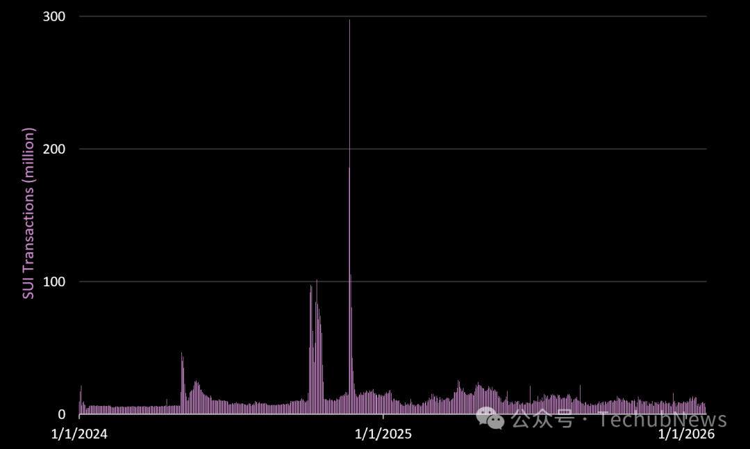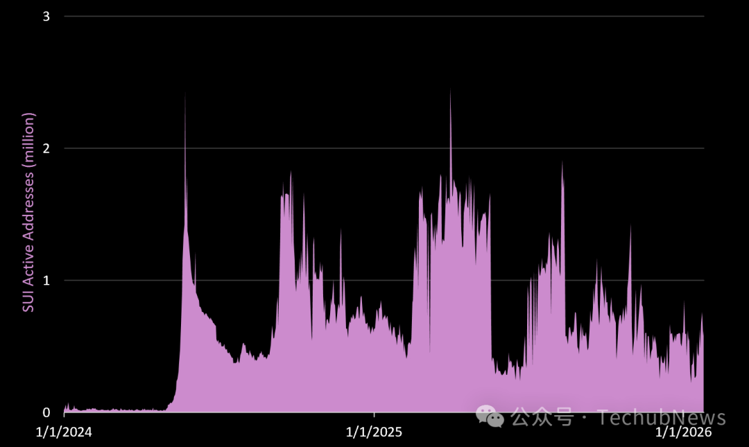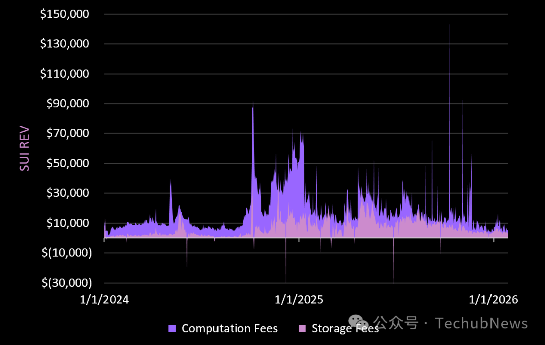 2025 年,Sui 生成的 REV 为 1060 万美元,高于 2024 年的 780 万美元(同比增长 36%)。目前,链上费用较 2024 年末的峰值水平下降了约 83%。